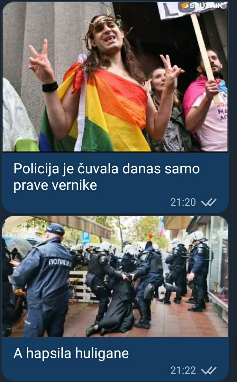 Не критикујем никога нити позивам на било какав дефетизам, али сваком нормалном човеку је већ негде од једанаест сати јутра кад су блокирани монаси на прилазу цркви светог Марка и није им дозвољено да оду до храма, било јасно да ће полиција ПО СВАКУ ЦЕНУ омогућити шетњу настраних и да се свака агресија може завршити само проливањем србске крви. Било је критика што су монаси уопште били пред кордонима, плашим се да би без њиховог присуства заиста пала крв у србској престоници. Допринос победи није истрчати из рова и узалуд погинути, из рова се истрчава кад стигне команда за јуриш и тога на жалост нису свесни људи са револуционарном, а не црквеном свешћу. Сестра Сузана је сјајно објаснила несрећницима у кордону који штите содомисте зашто 17. септембра није било 100 хиљада на улицама, јер народ није желео да се узалудно пролива србска крв, то су прижељкивали амбасадори и содомисти-сатанисти. Рекла им је истину у очи и добро је да је то снимљено, да се стиде ако су на то способни, да схвате да су били чувари нереда а не реда, да су били јањичари зулумћари, а не србски полицајци.